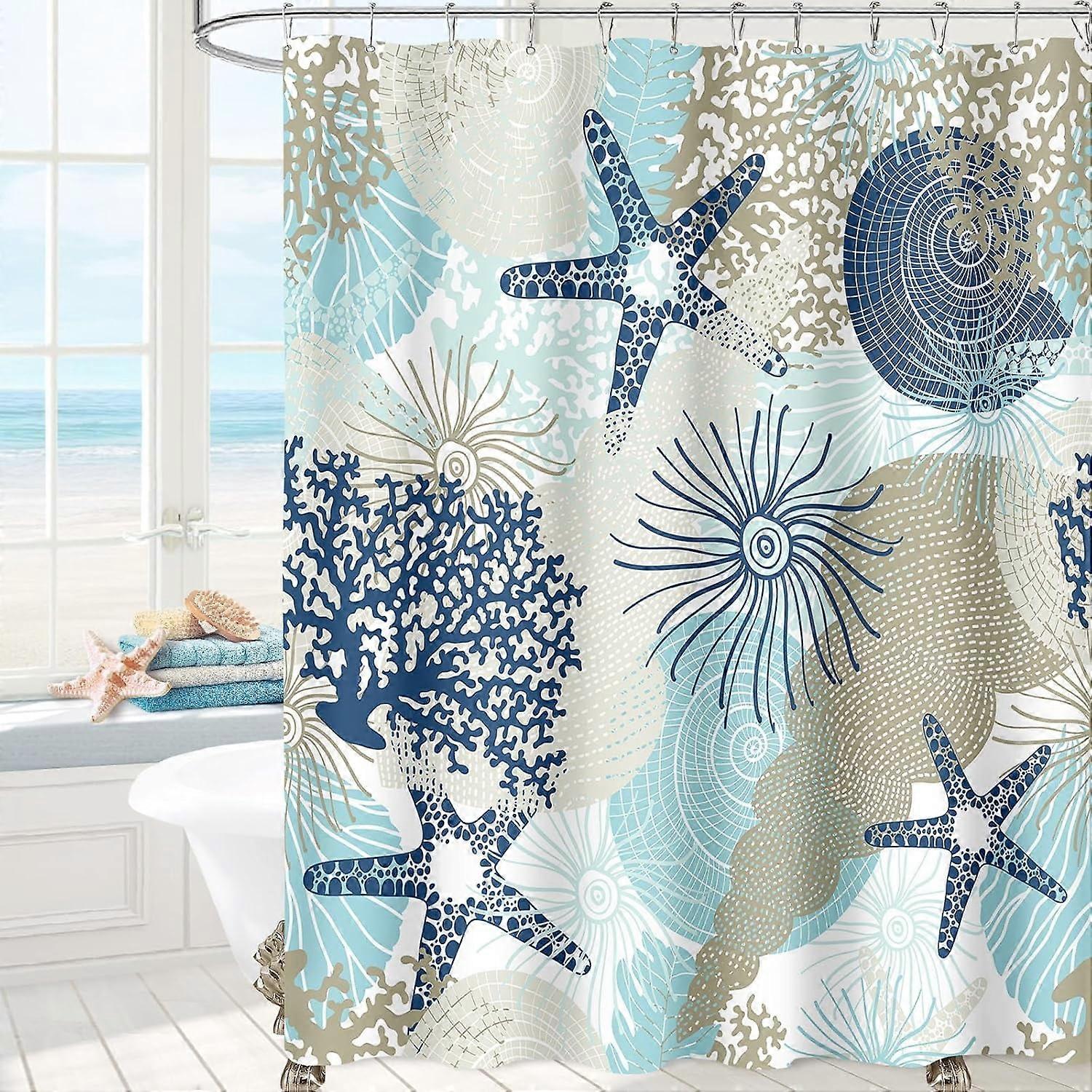 Beach Ocean Themed Shower Curtain, Cute Nautical Coastal Bathroom Decor, Summer Tropical Seashell Starfish Coral Fabric Set with Hooks, Teal Blue,