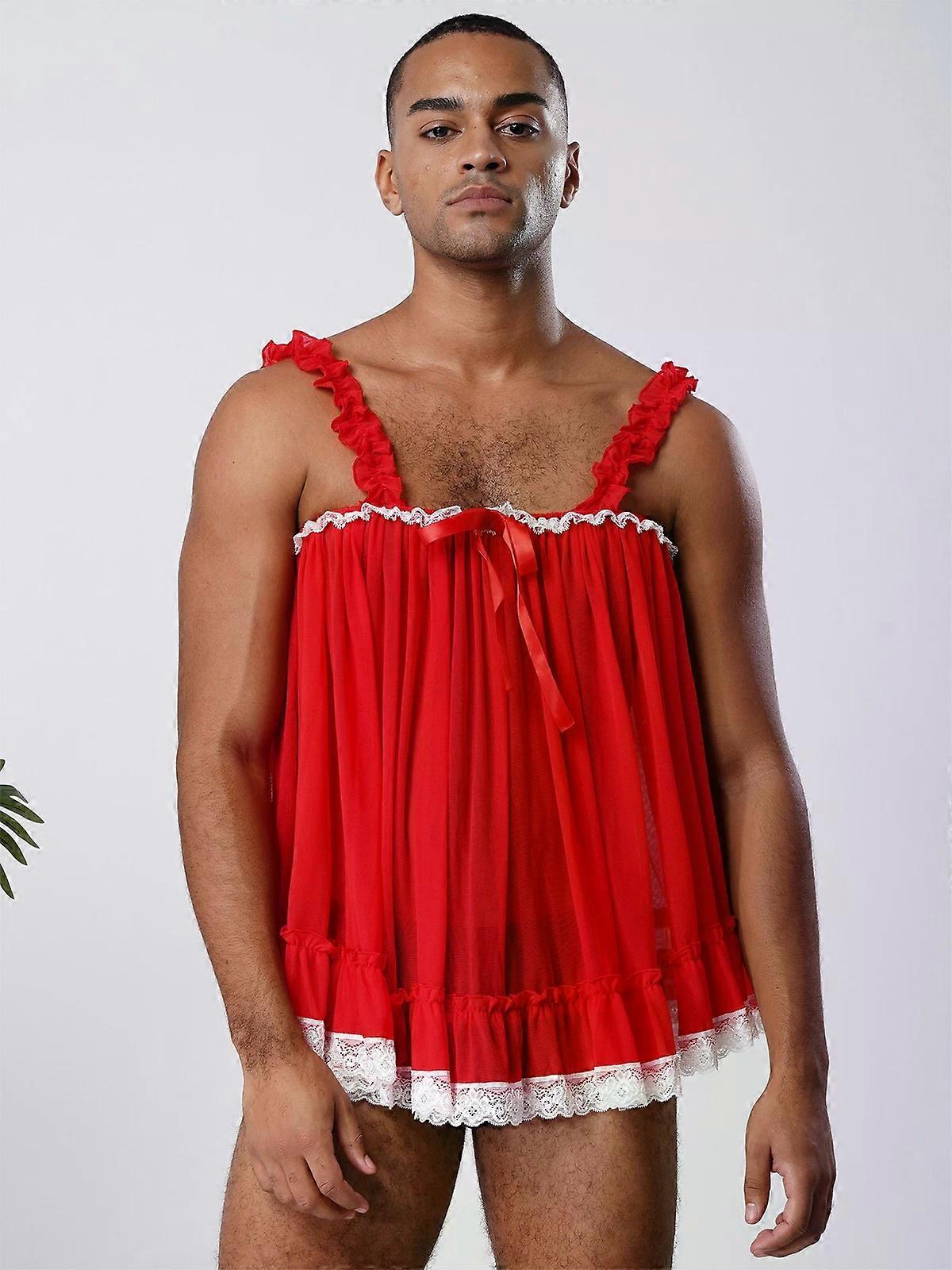 Mens Sheer Lace Trim Camisole Sissy Sleepwear Crossdress Lace Teddy Nightwear