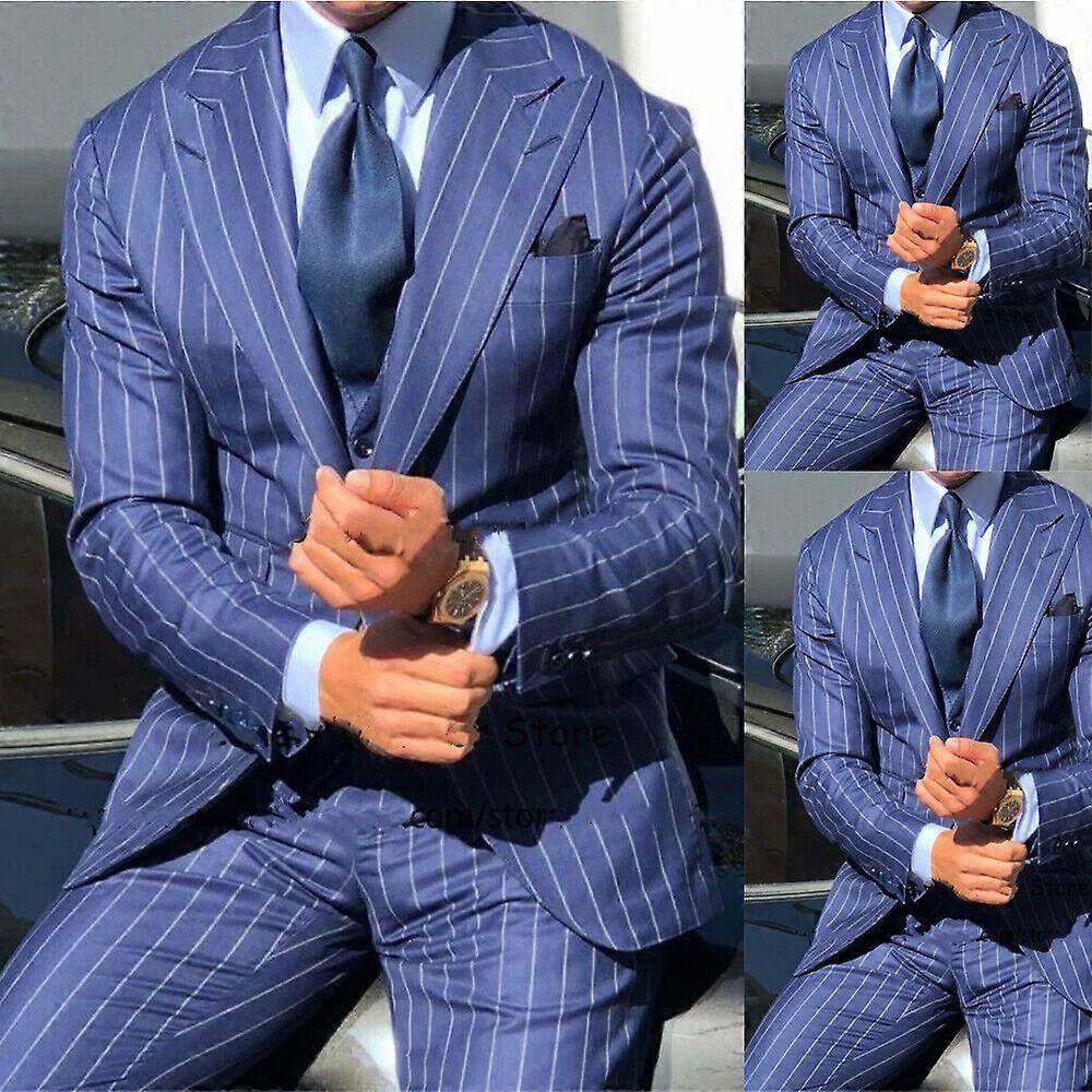Blue Striped Men Suits Slim Fit Wedding Groom Tuxedo Peak Lapel Business 2 Piece