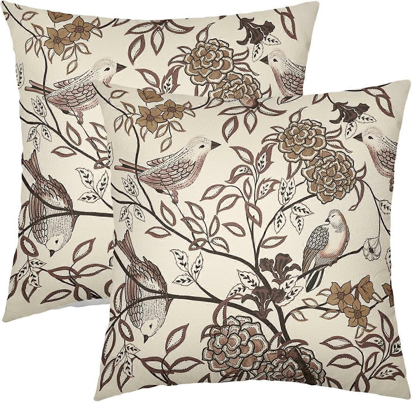 Vintage Floral Bird Pillow Covers 18x18 Inch Set of 2, Brown Flowers Leaves Decorative Throw Pillows for Couch, Chinoiserie Square Cases for Sofa,