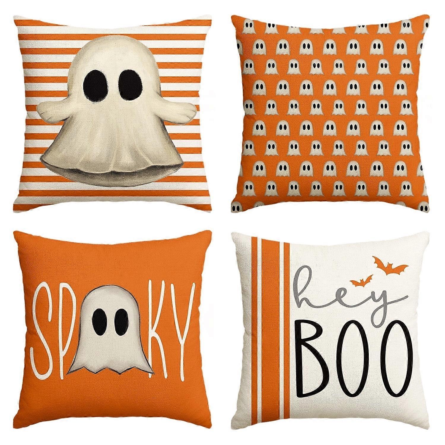 Sm:)e Scary Hey Boo Cute Ghost Spooky Halloween Throw Pillow Covers, 20x20 Inch Set of 4, Striped, Orange