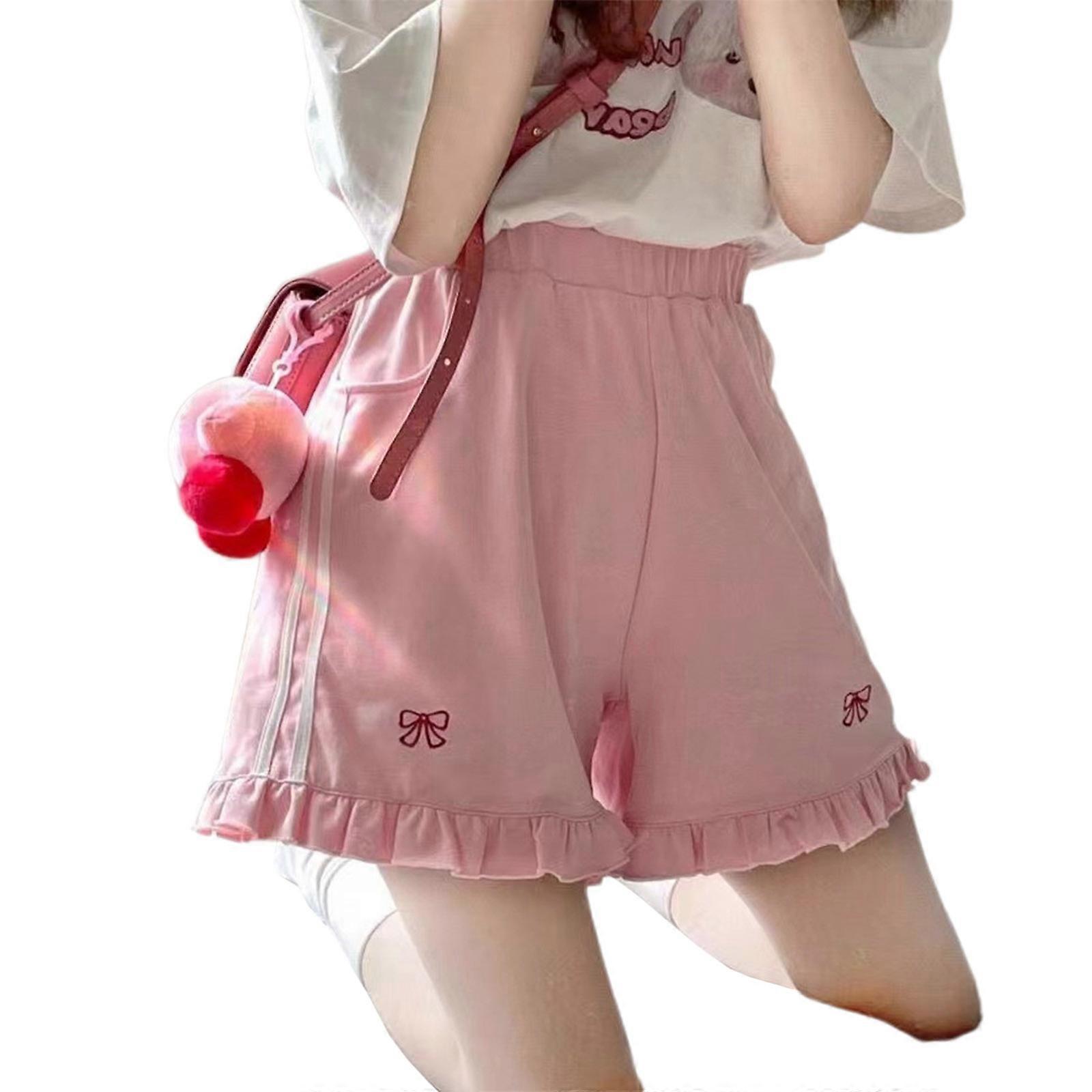 Womens Summer Embroidery Bows Parttedn Shorts Loose-fit Lacy Edge Shorts Sweet Casual Bottom Wearing for Daily School Pink XL