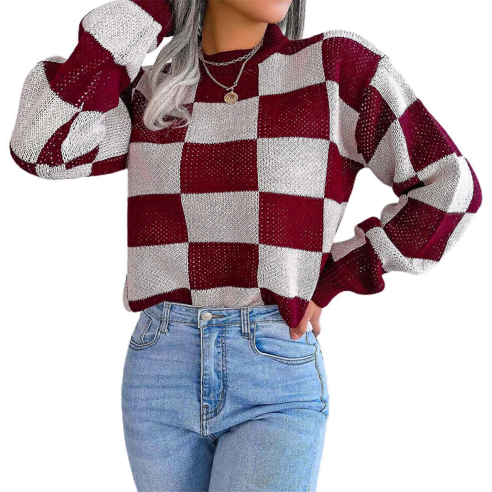 Women Round Neck Lattice Pattern Sweater Casual Pullover Loose Long Sleeve Pullover Autumn Drop Shoulder Knit Tops Burgundy S