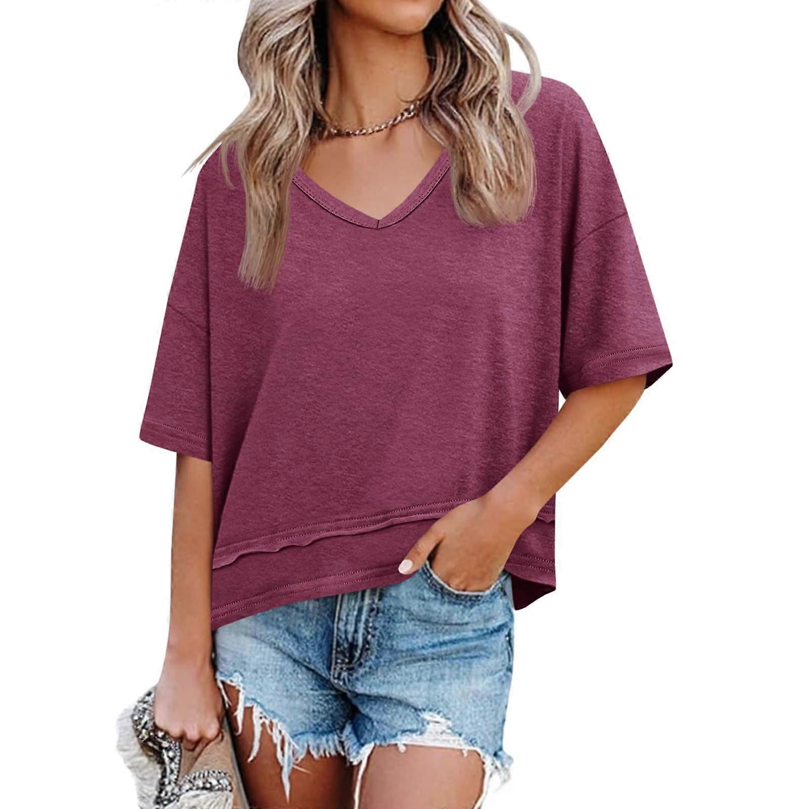 Women's Summer Basic T-Shirt V-Neck Short Sleeve Loose and Flowy Cut Casual and Modern Design Burgundy XL