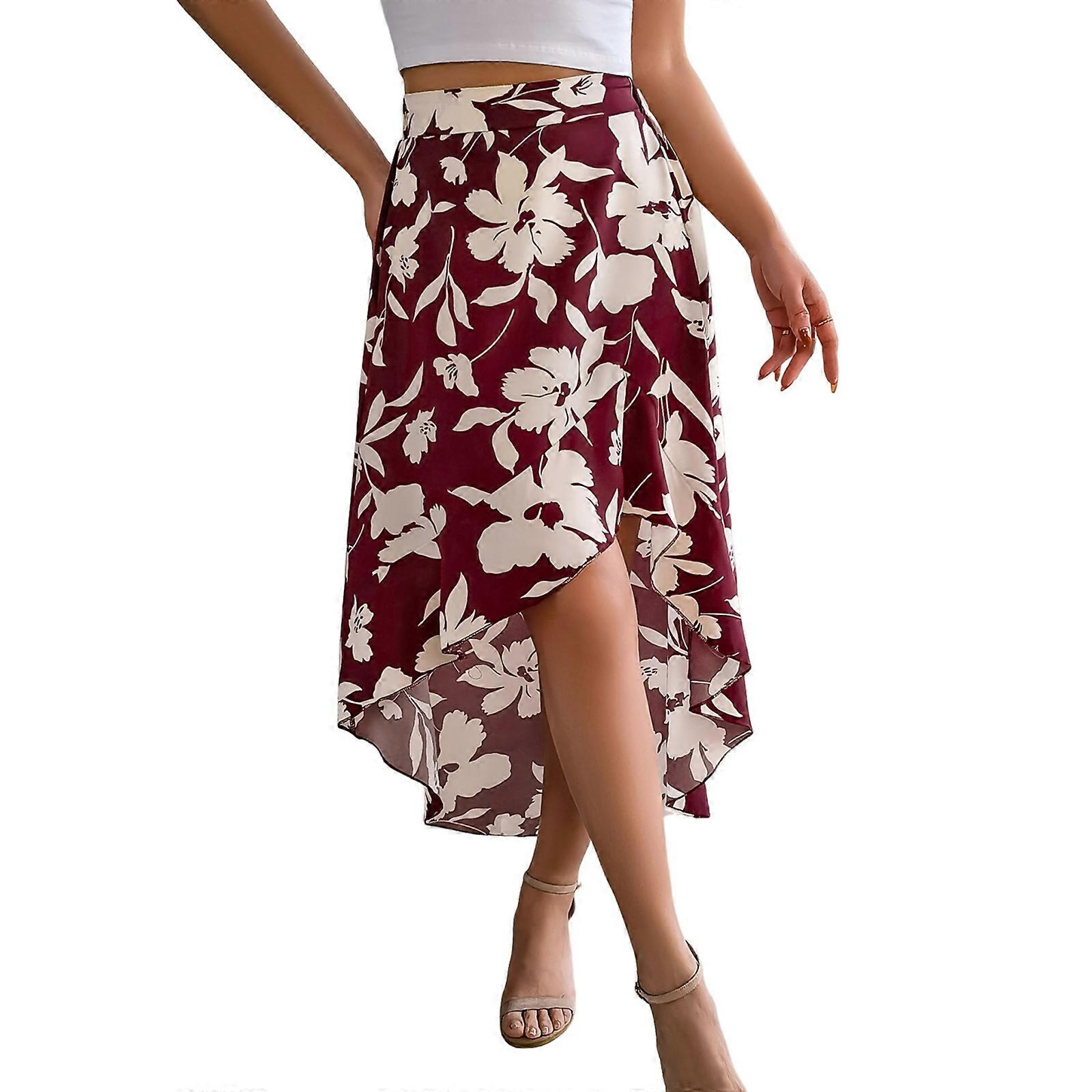 Women's Long Skirts Boho Floral Elastic High Waist Asymmetrical Hem Midi Skirt Burgundy XL