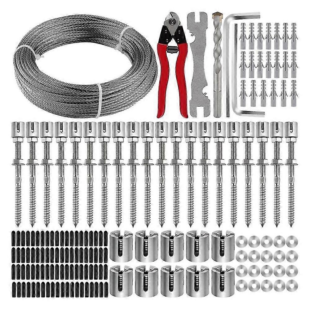 This garden wire trellis is designed for mounting on various surfaces, including concrete, stucco, brick, masonry, siding, and wood panels. The wall wire trellis kit is suitable for running lattice wires along walls and other vertical surfaces to train climbing plants such as vines, creepers, and roses. All parts are constructed from stainless steel, which carries loads from plant growth and is weatherproof and rust-resistant. The trellis cable system provides flexible options to design plant climbing shapes, including square, diamond, fan, or a combination. This kit can be expanded with other sets. The wire trellis system provides necessary ventilation for healthy plant growth. The kit includes: 20 classic heavy-duty crosshead standoffs, wire rope, 10 cable clamps, 20 plastic expansion anchors, 20 washers, 80 PVC end caps, 1 hex key, 1 all-purpose spanner, 1 matching drill bit, and 1 cord cutter. Suitable for most climbing plants such as wisteria, honeysuckle, grapevine, roses, and blackberries, as well as other plants that require support structures.