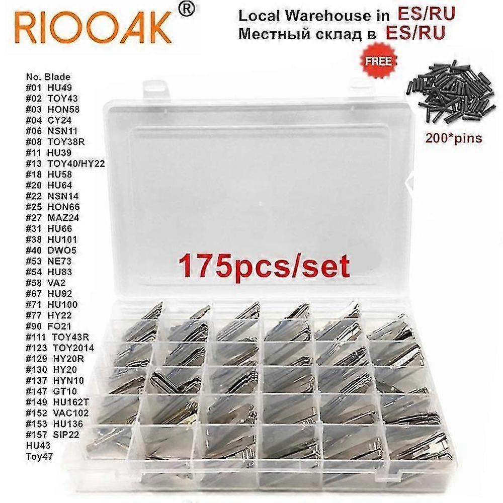 This kit contains 175 pieces of car key blanks for flip or folding remotes. It includes 35 styles of key blades and 200 pins for assembly. Condition: New. Package Contents: - 175 key blanks (35 styles, 5 pieces per style) - 200 pins - 20 logo stickers (10 pieces per style). Origin: China.