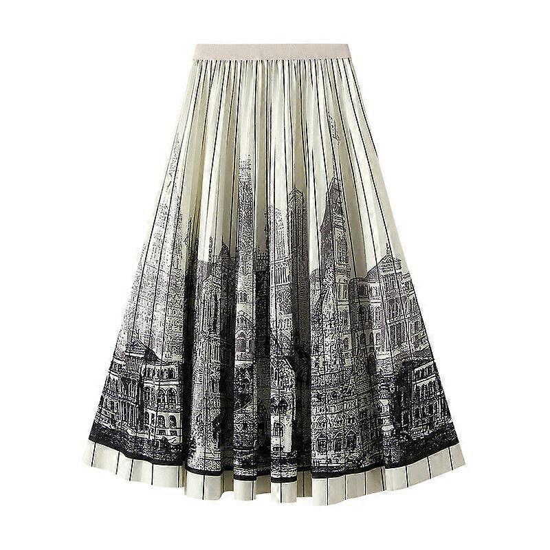Women's Landscape Print Waist Swing Flowy Pleated High Elastic Midi Long Skirts