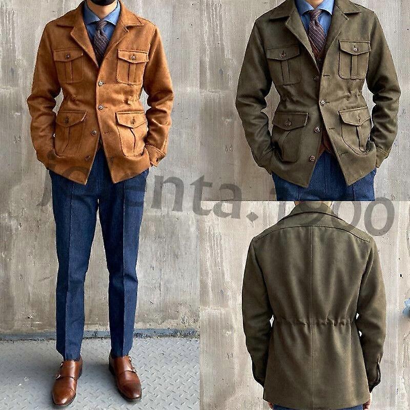 Suede Men Jacket Safari Blazer Multiple Pockets Vintage Single-Breasted Coat New