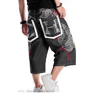 Men Embroidered Denim Shorts Hip Hop Snake Straight Baggy 3/4 Casual Jeans New