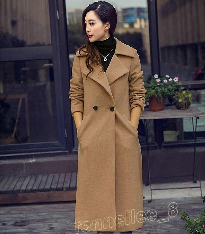 Womens Wool Blend Lapel Double-breasted Trench Coat Long Slim Fit Jacket Outwear