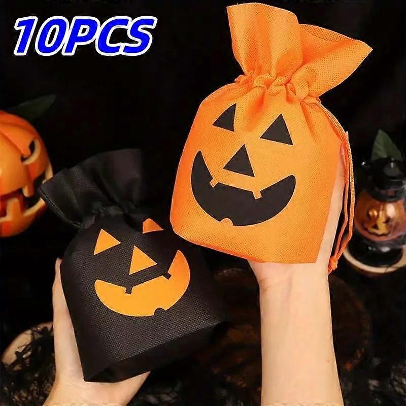 10pcs Halloween Pumpkin Gift Bags, Cute Cartoon Jack-O-Lantern Design, & Ribbons, Durable Candy Treats Packaging