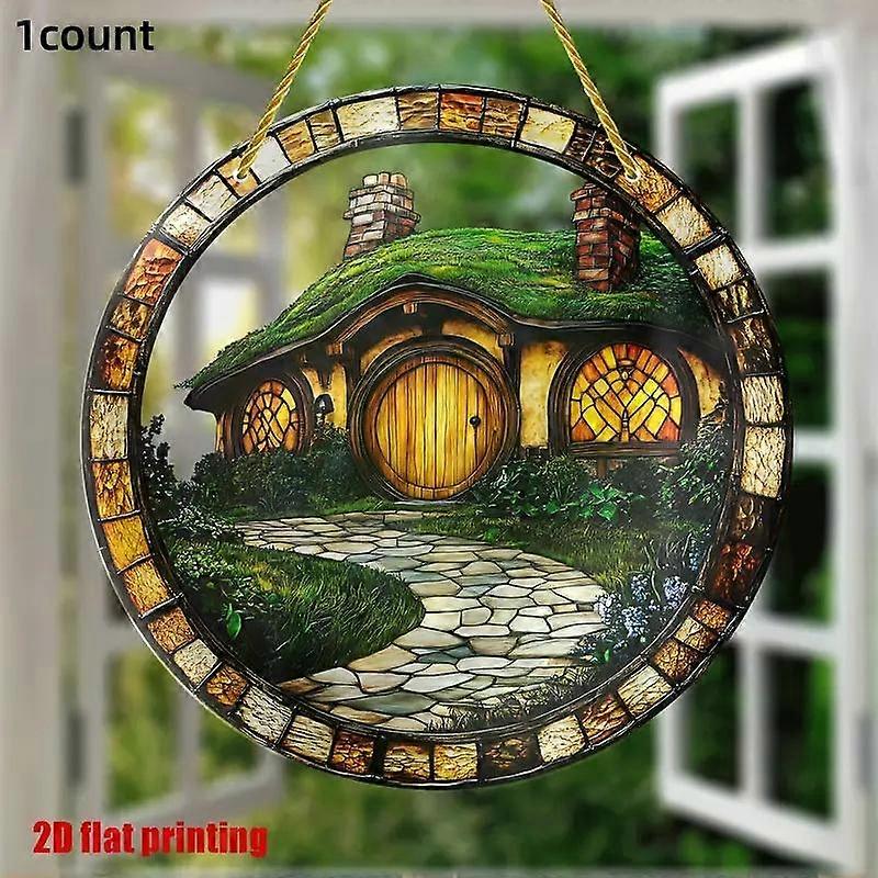 2D Acrylic Wall Hanging, 8 Inch Round Country Cottage Design with Stone Path & Greenery, Perfect for Living Room Porch Garden Decor Gift