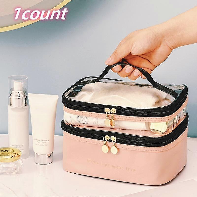 Transparent Double-Layer PU Makeup Bag, Portable Stylish Handheld Cosmetic & Toiletry Organizer, Waterproof Travel Wash Bag for Girls Gifts