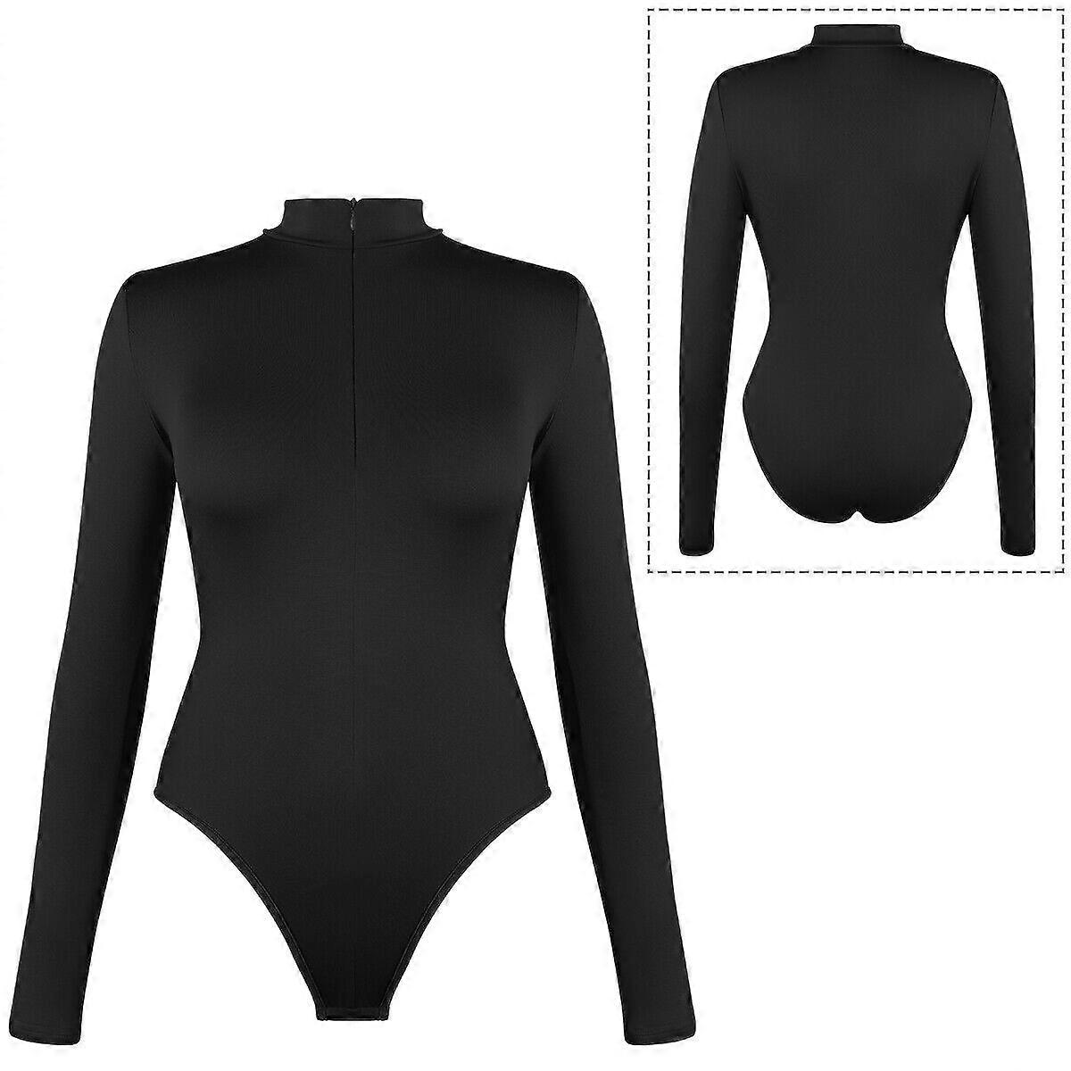 US Women Long Sleeve Mock Neck Bodysuit Plain Leotard Fitted Zipper Top Jumpsuit