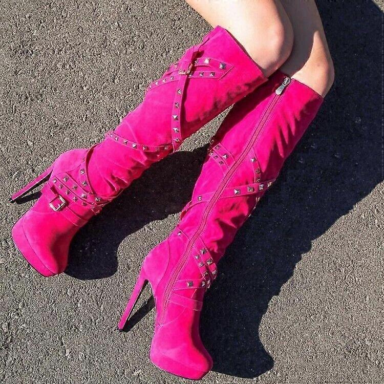 STYLISH Women Knee High Boots Slim Heels Fucshia Party Shoes Woman Big Size 4-15