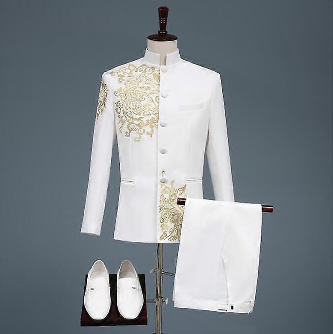 New Men 2pcs Suit Chinese Tunic Slim Fit Casual Style Formal Wedding Suit Floral