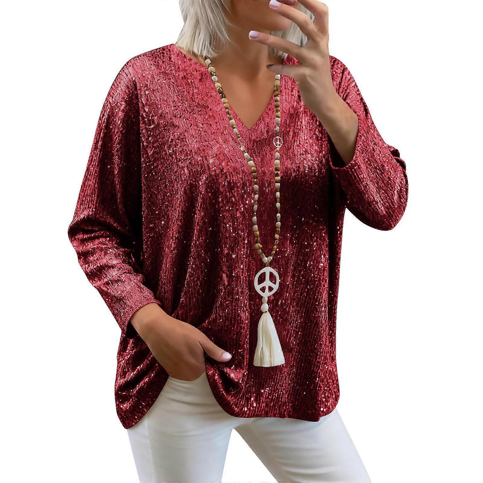 Tops Solid Color for Women Loose Fit Glitter Long Sleeve Shirts Trendy Fashion V Neck Top Claret XL