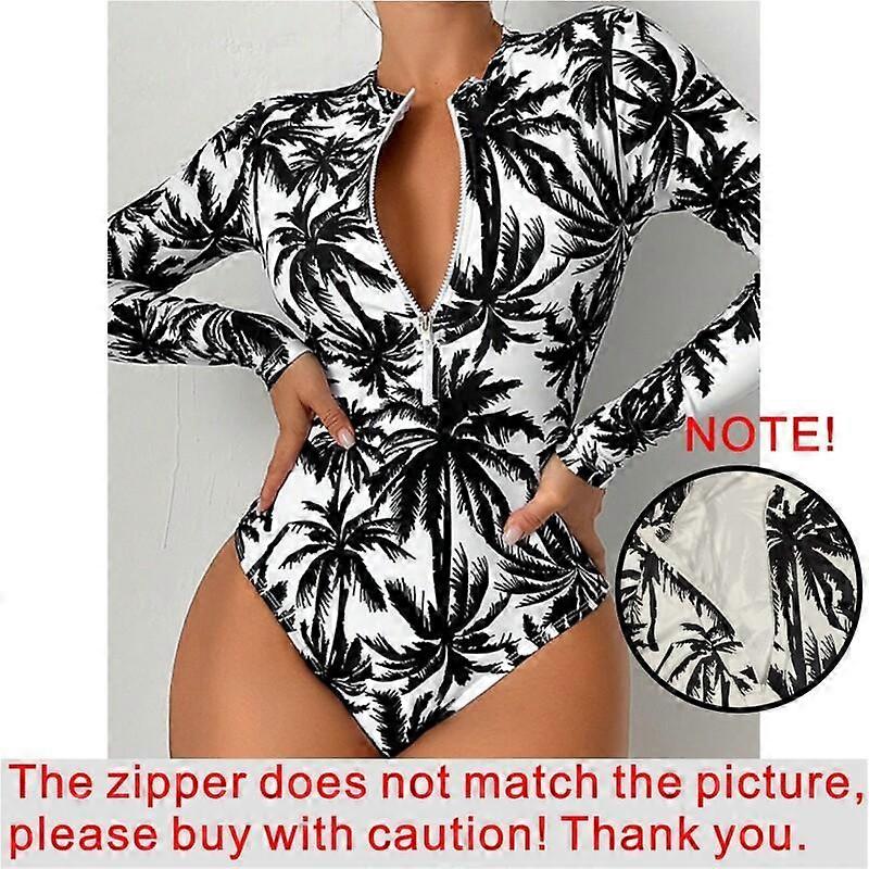 Maillot de bain une pi��ce pour femmes, manches longues, fermeture ��clair sur le devant, imprim�� feuille de palmier, noir, vert, Sexy, pour b