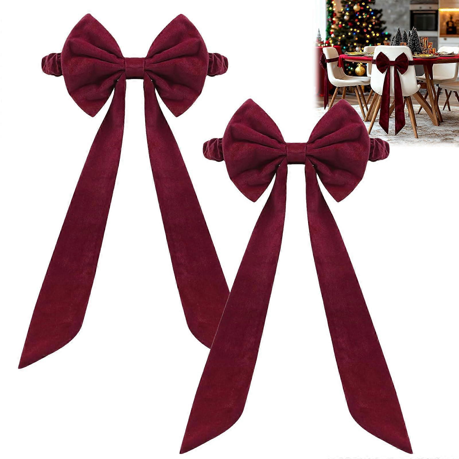 2PCS Christmas Wine Red Velvet Chair Sashes with Elegant Oversized Bows for Dining Room and Party