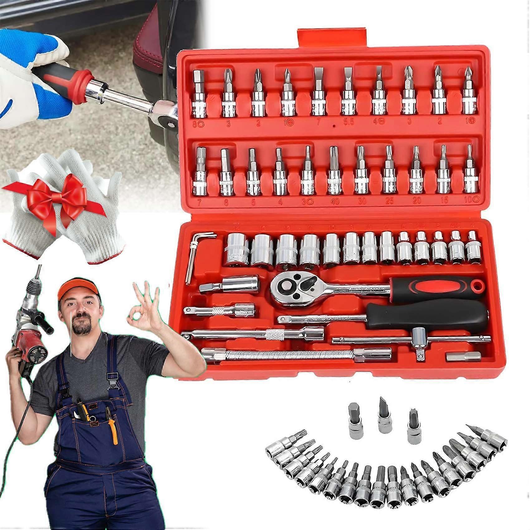 Cordless Electric Ratchet Wrench Set with 46 Chrome Vanadium Tools, Slim Design, Red