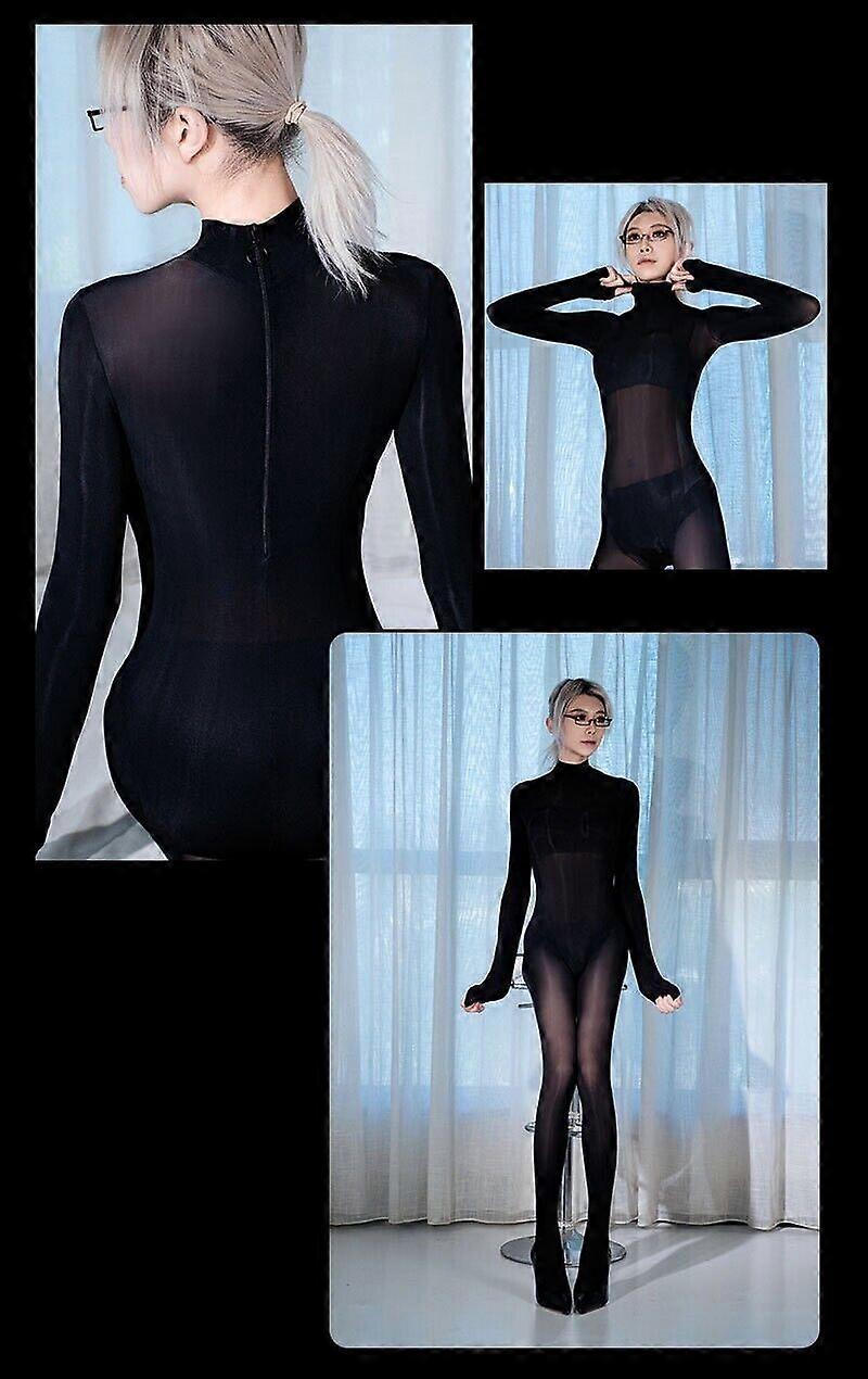 Unisex 20D Shiny Glossy Bodystocking Back with Zipper Bodysuit Catsuit w/ Gloves