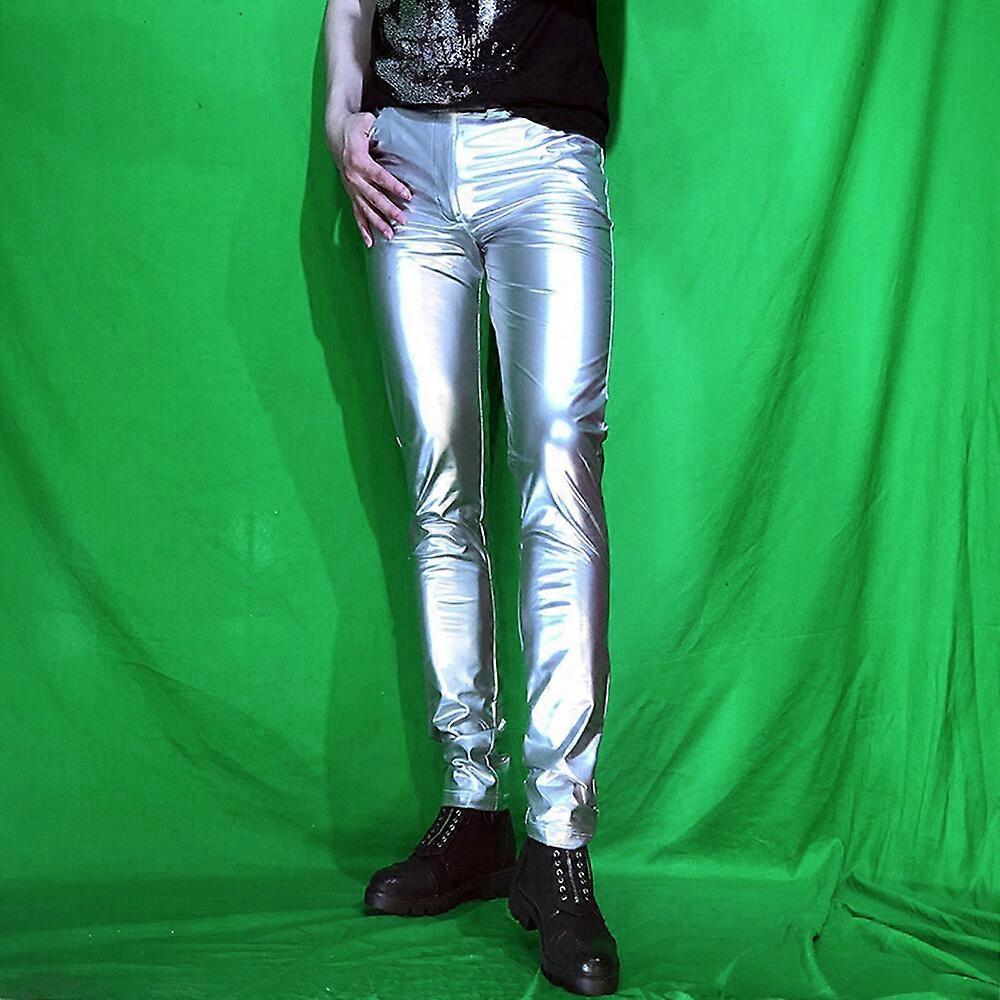 Men Shiny Metallic Faux Leather Pants Skinny Stretch Slim PU Trousers Club Dance
