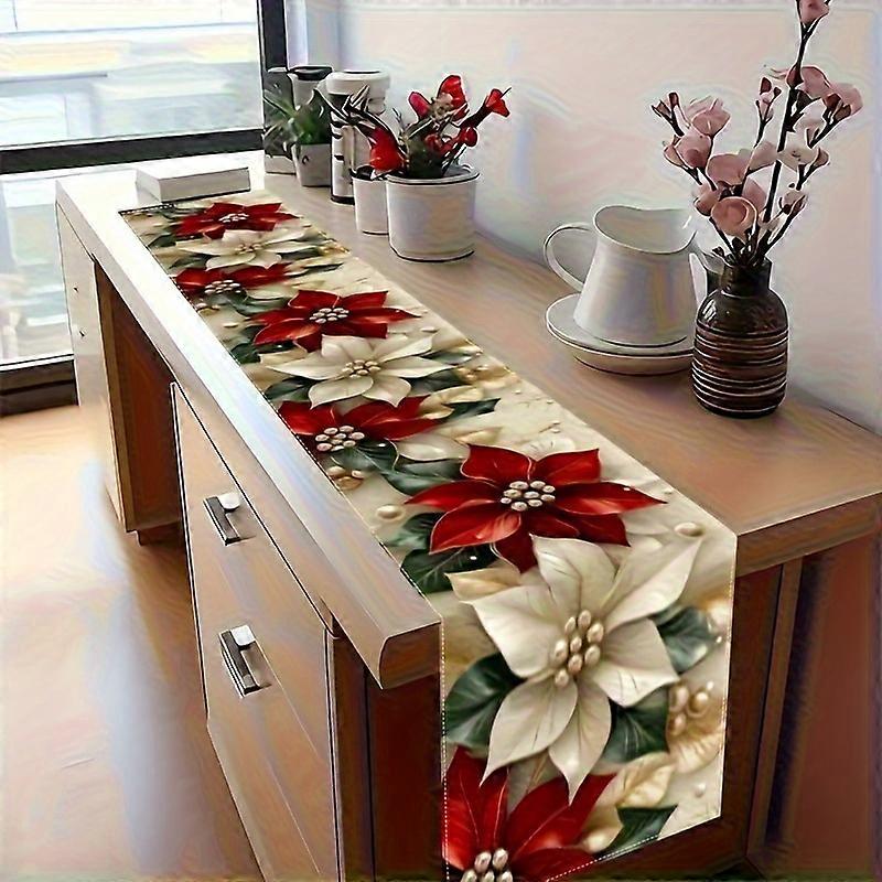Merry Christmas Poinsettia Print Linen Table Runner Holiday Party Decor Winter Kitchen Dining Table Runner Christmas Decorations