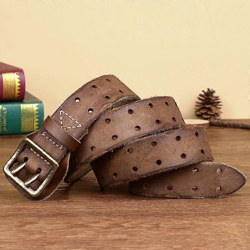 Men Retro Genuine Leather Double Prong Belt 38mm Distressed Brass Buckle Belt