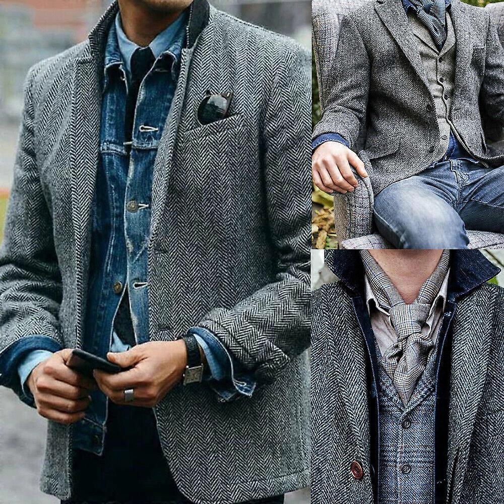 Men's Gray Herringbone Suits Jacket Tweed Casual Wear Blazer Business Workwear