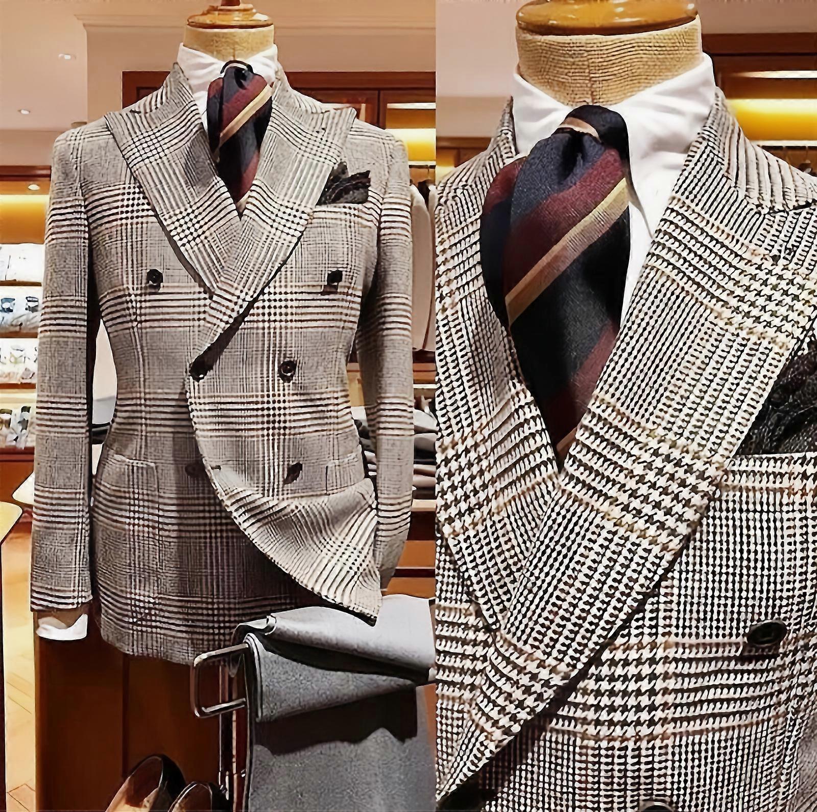 Houndstooth Men Suits Wide Peak Lapel Jacket 2 Pcs Double Breasted Coat Business
