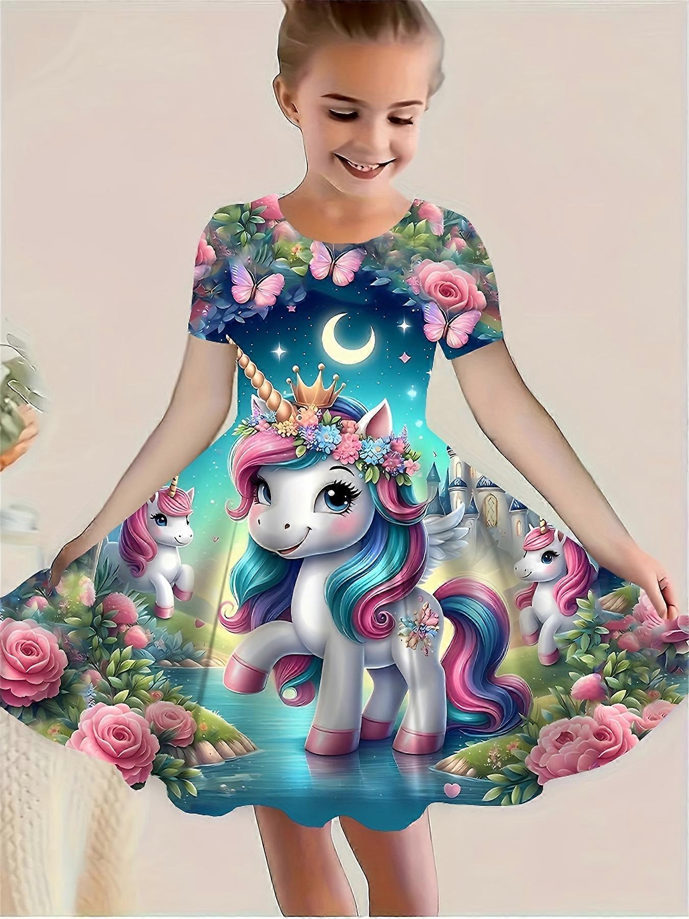 25-26 New Summer Kids Girls Dress Cute Unicorn 3D Print Clothes Short Sleeve Performance Casual Clothes Skirt
