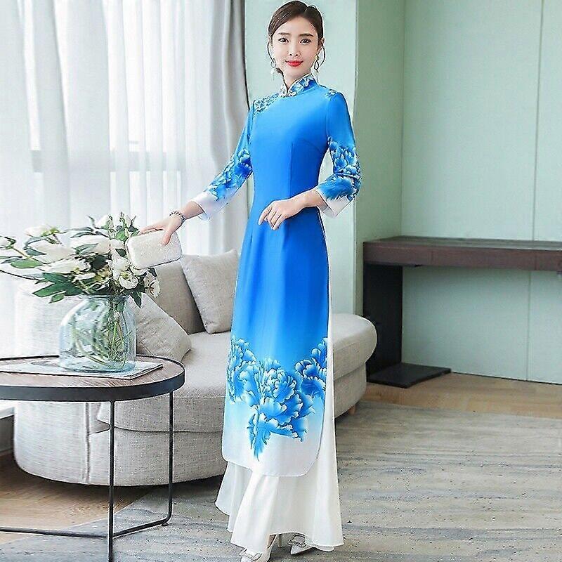 Lady Chinese Cheongsam Qipao Dress Floral Print Maxi Long Mandarin Collar Ethnic