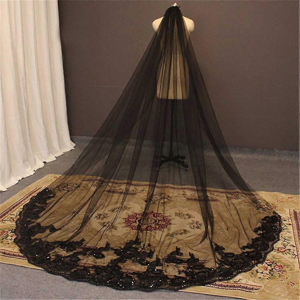 Real Photos Black Bridal Wedding Cape Boleros Veils Sequins Lace Cathedral Long