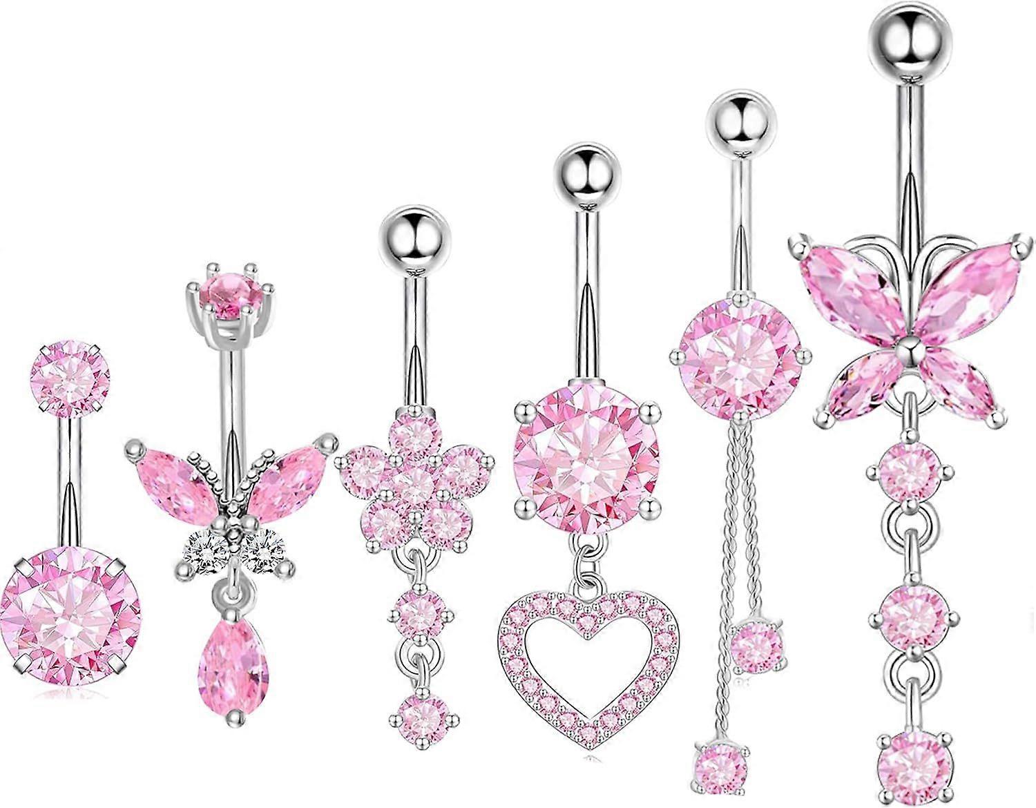 Surgical Stainless Steel Dangle Belly Button Rings for Women Belly Ring Dangling Piercing Jewelry with Heart Flower Butterfly Silver 14G pink