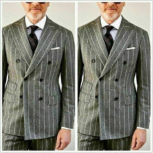Gray Pinstripe Men's Suits Double Breasted Groom Business Wool Blend Tuxedos