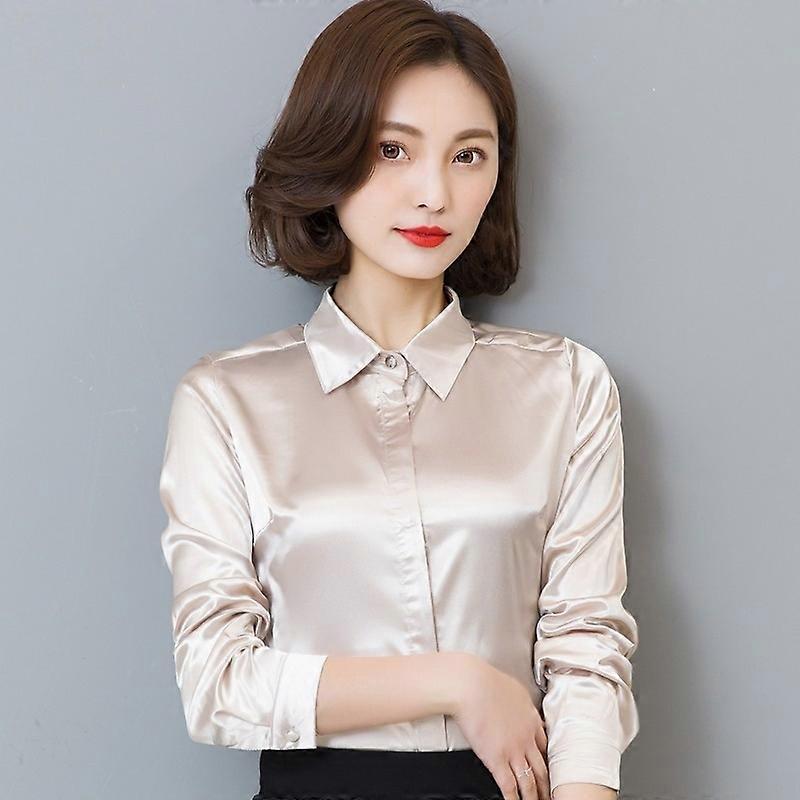 Women Satin Silk Like Wet Look Slim Blouse Lady Long Sleeve Collared Basic Shirt
