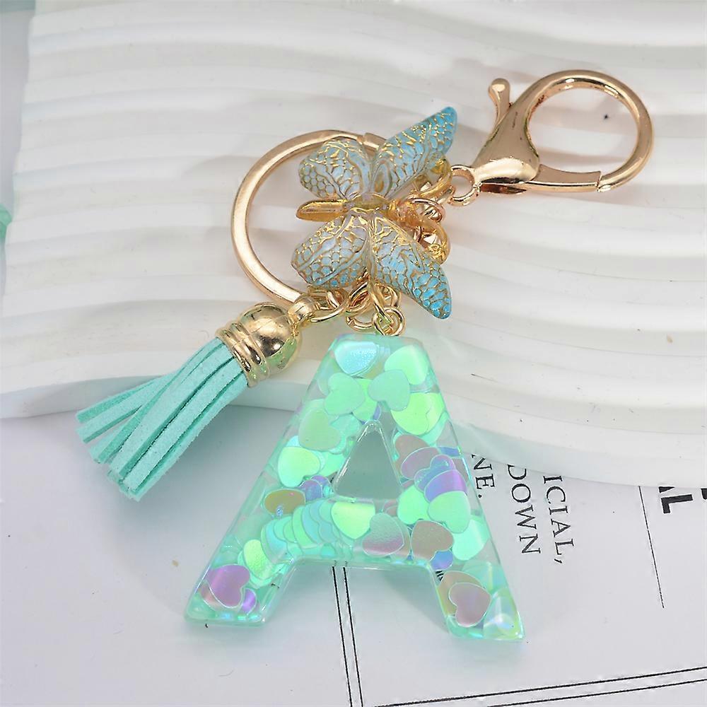 Fashion Green Tassel Butterfly 26Letter Keychain Heart-shaped Sequin Filled Resin Alphabet Keyring for Women Car Handbag Pendant