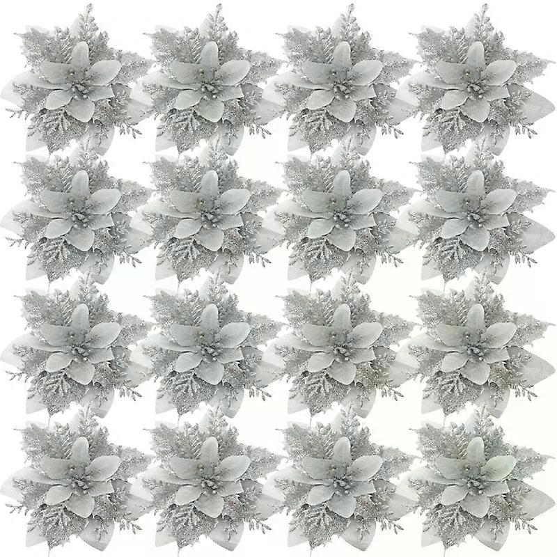 Large Glitter Artificial Christmas Flowers with Clips DIY Fake Flower Xmas Tree Ornaments for Home New Year Decoration Supplies