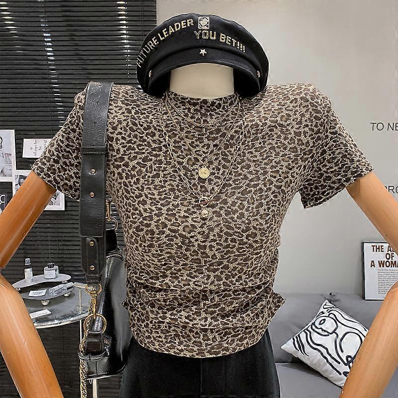 Temperament girl retro pleated leopard print design slimming fashionable short sleeved T-shirt Top