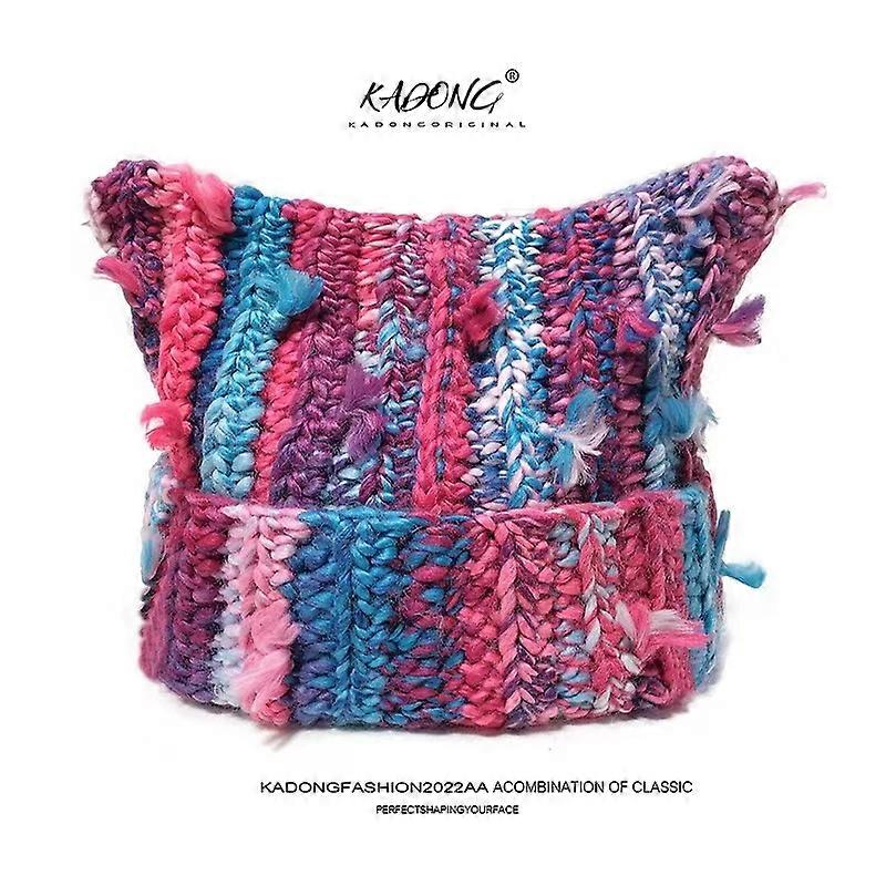 Japanese Cute Mixed Color Striped Cat Ears Fringed Knitted Hat Women Winter Warm Ear Protection Hand Crocheted Skull Beanie Cap