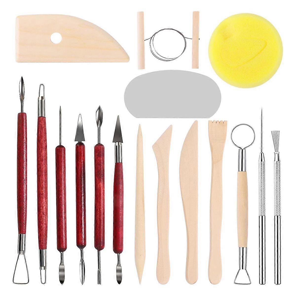 [17PCS Clay Tools Kit]6 wooden clay tools, 7 metal clay tools, 2 metal needle tool,1 metal rib,1 pottery sponge, 1 storage bag, easy to carry. [Multi Functional Clay Tools For DIY]The clay tools can be use as sculpting, modeling, molding, cutting,shaping, scraping, smoothing, brushing, dotting, carving, drawing tools. [A Nice Gift For Pottery DIY Enthusiast]It can be used in school clay class, pottery DIY activity, family pottery activity, parenting clay activity.It help you to a simple and by yourself. It's a nice gift for clay DIY beginners or professionals. [Exploring Your Life With Our Ceramics Tools]You can use our ceramics tools to DIY a pottery as a gift for yourself, your friend, your kids or your family.Our air dry clay kit helps you to explore your life, and promote your creativity and imagination. [Practical Pottery Tools Set]The pottery tools are made of wood, stainless steel, plastic and other materials, simple and sturdy, easy to use and storage. Color: As Shown Material: Wooden Pole + Metal + Sponge Package Contents: 1*clay tools set Only the above package content, other products are not included. Note: Light reflection and different displays may cause the color of the item in the picture a little different from the real thing. The measurement allowed error is +/- 1-3cm.