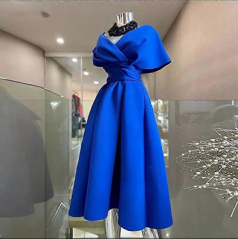 Satin Tea Length Evening Dress For Wedding Off Shoulder Simple Formal Prom Gowns