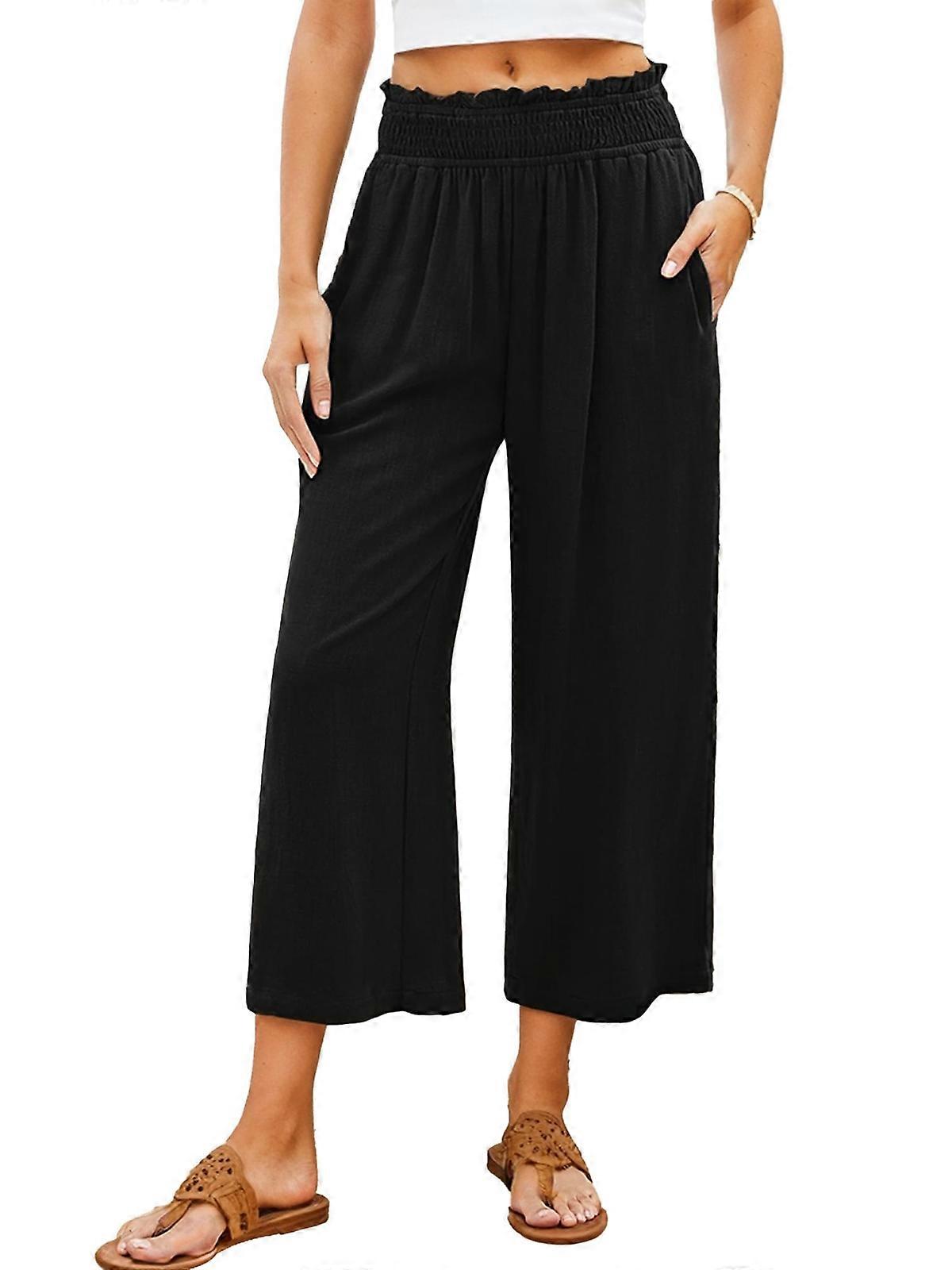 Women Capri Pants High Waisted Wide Leg Palazzo Trousers Pull On Elastic Smocked