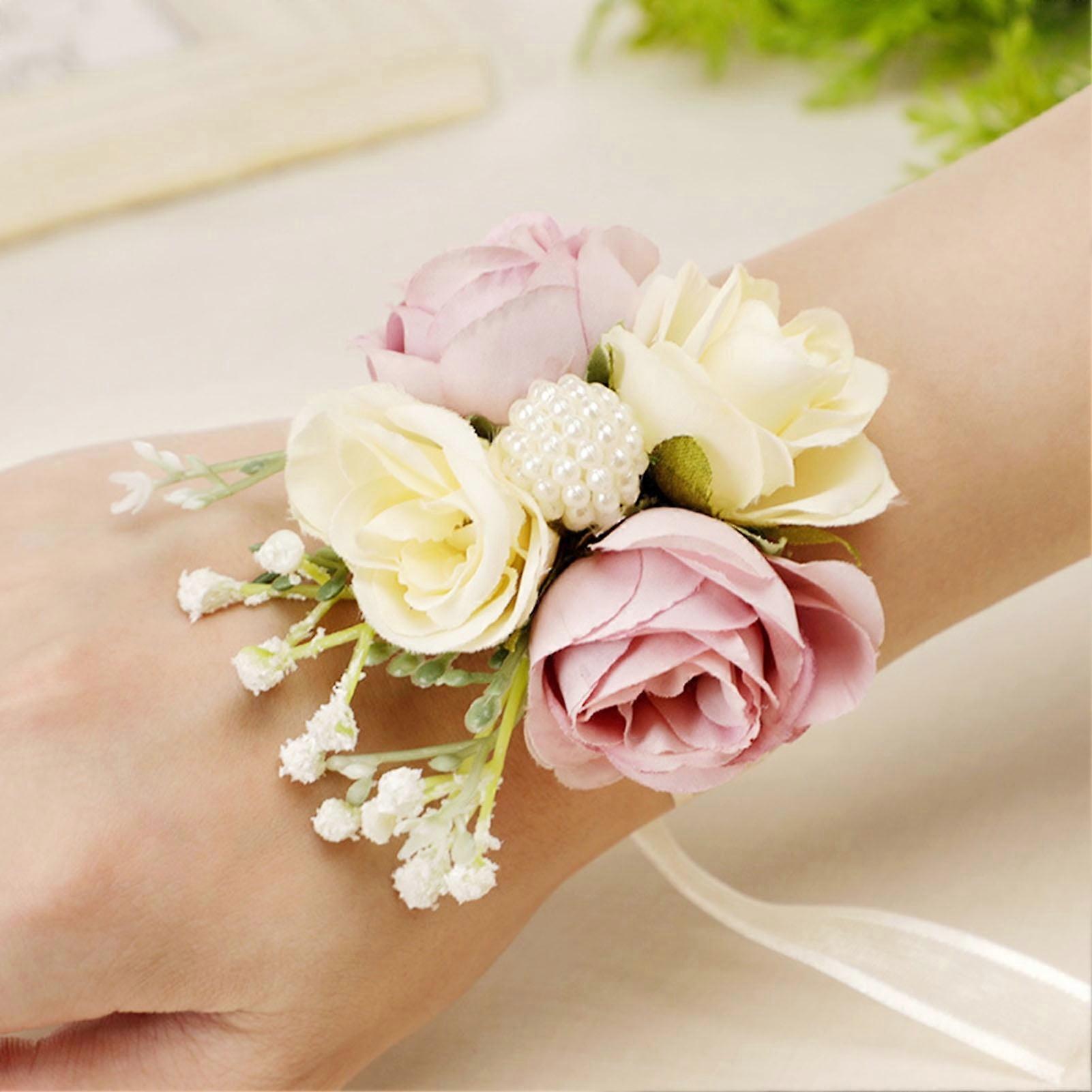 SUSUchens Elegant Fine Texture Wrist Flower Beautiful Stylish Faux Silk Flower Artificial Flower Wristband for Wedding Champagne