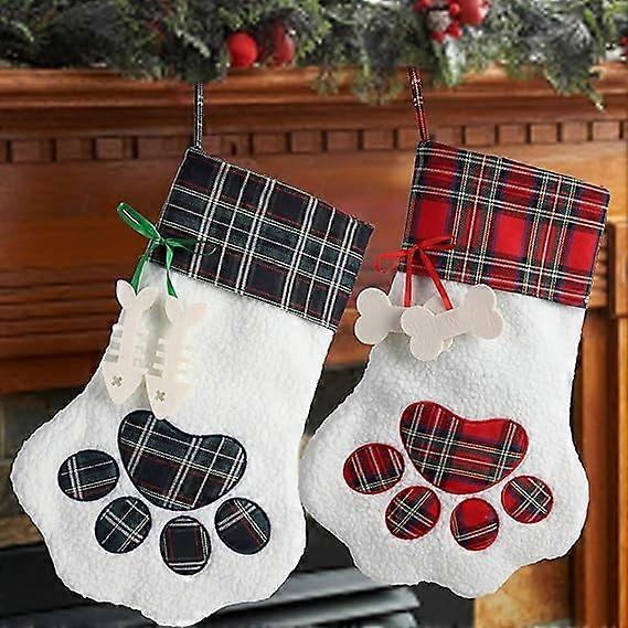 2 Pcs Pet Dog Cat Paw Plush Christmas Stockings with Red Plaid Cuff, Faux Sherpa Lining, Fireplace Hanging (17.32inch)