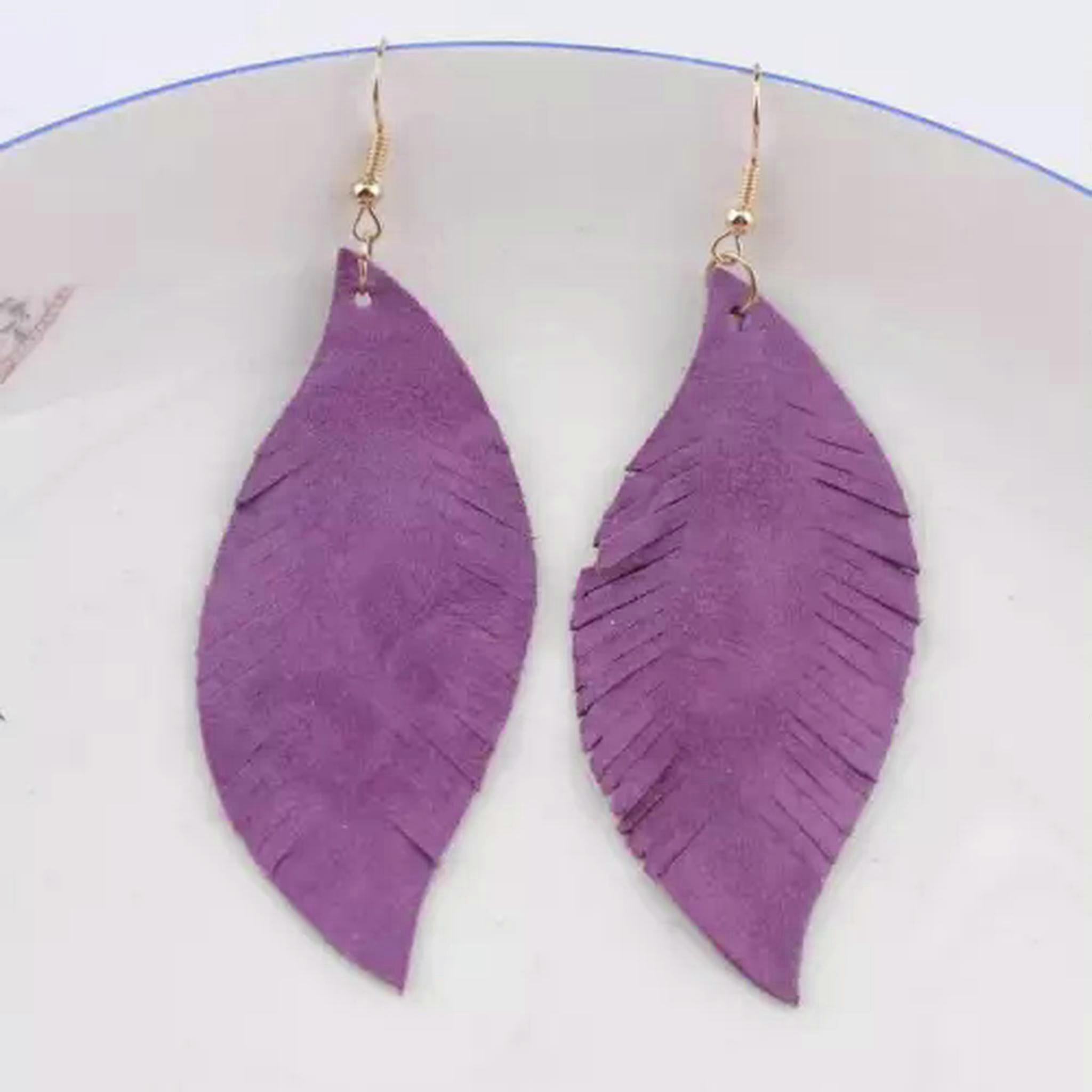RSAMD Leaf Shape Genuine Leather Fringe Feather Statement Earrings Women Custom Design-Violet