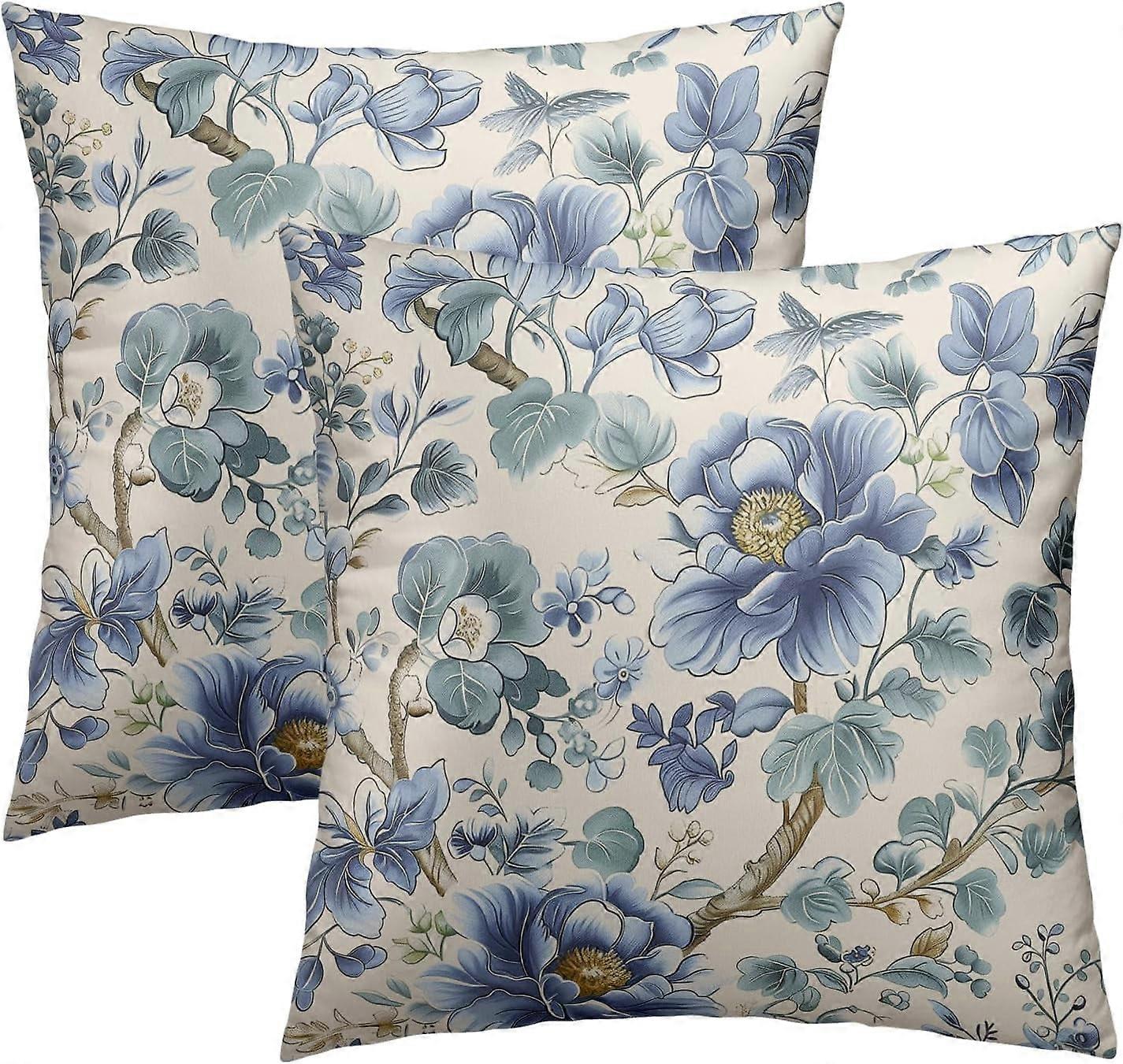 Blue Flower Throw Pillow Cover 16x16 Inch Set of 2, compatible with blue and white chinoiserie floral decor, cotton cushion covers for home, sofa,