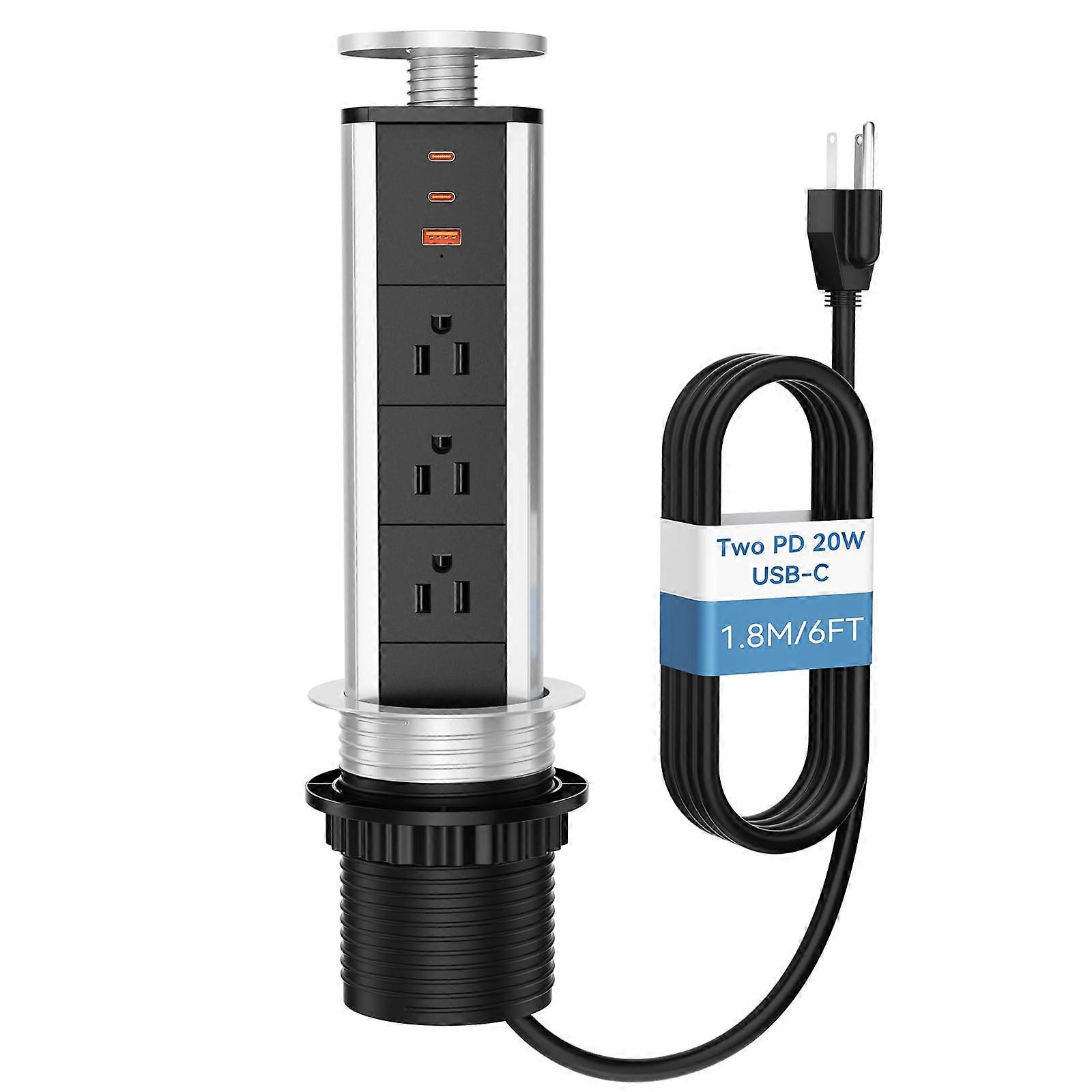 Pop Up Outlet with USB C and 2 USB A Fast Charging, 3 AC Outlets for Kitchen Countertop, Silver Black