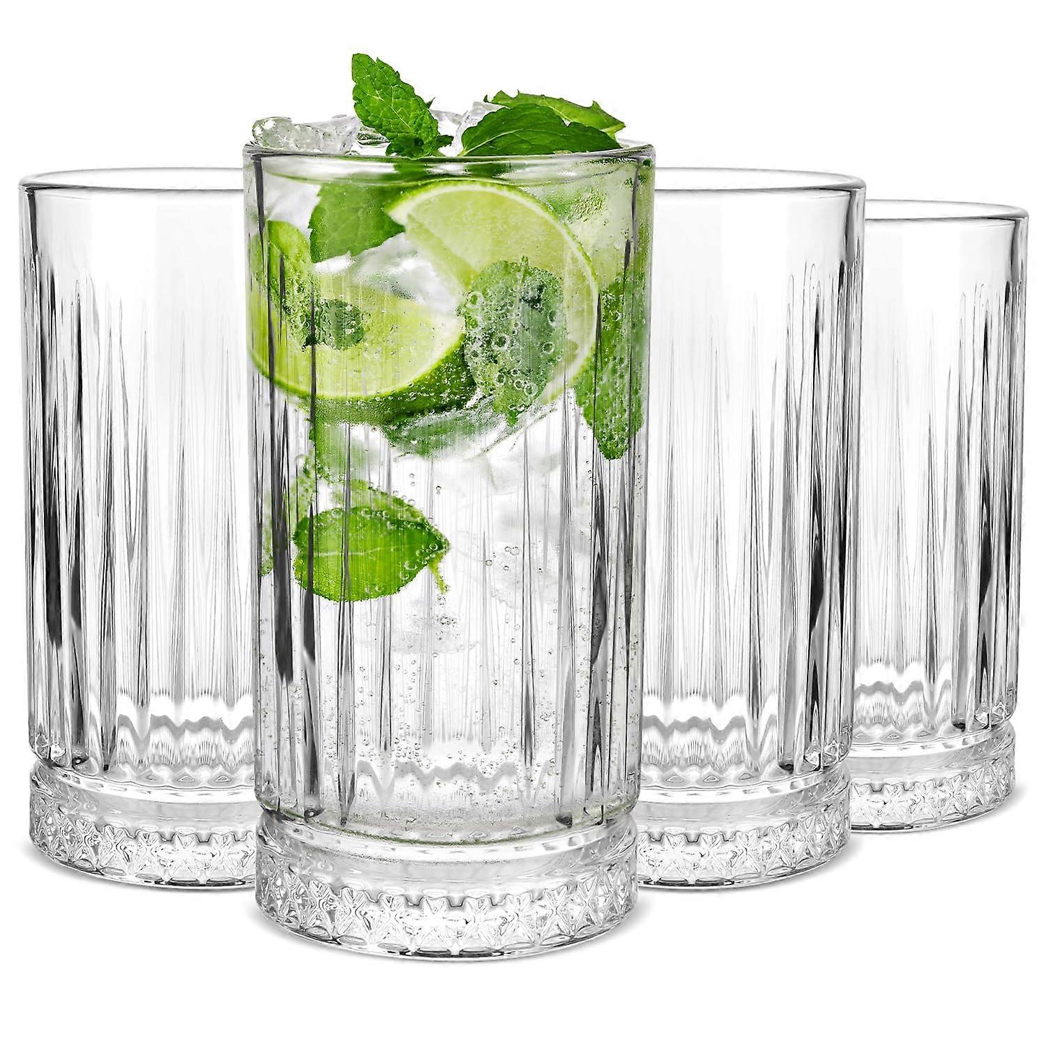 Set of 4 Vintage Embossed Highball Glasses 16oz Lead Crystal Tall Drinking Glassware for Cocktails and Water